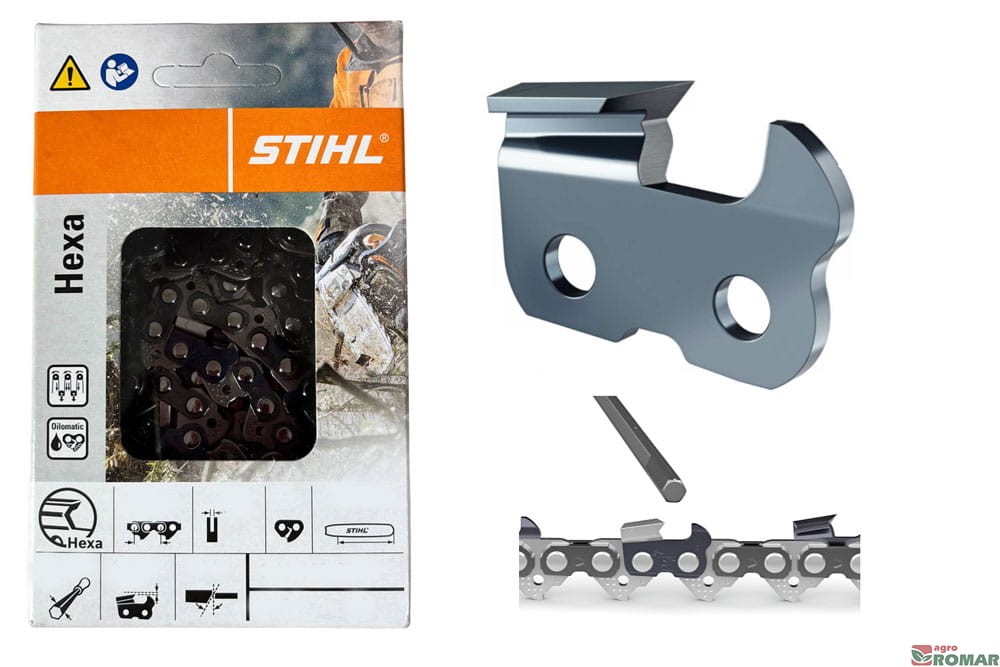 Profesjonalny łańcuch tnący STIHL Rapid HEXA 3/8" o unikatowym kształcie półki tnącej. Pracuj do 15% dłużej na jednym ostrzeniu przy zachowaniu blisko 10% szybszej wydajności cięcia!