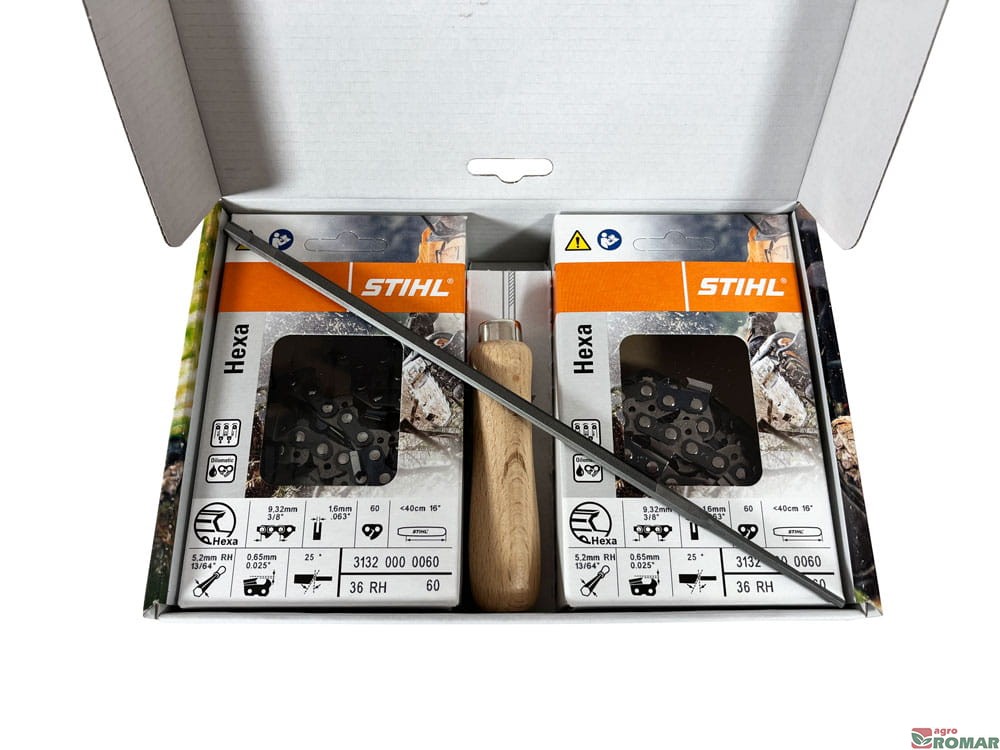 Zestaw do przezbrojenia pilarki STIHL w nowy układ tnący HEXA, zawiera dwa łańcuchy, pilnik oraz uchwyt pilnika.