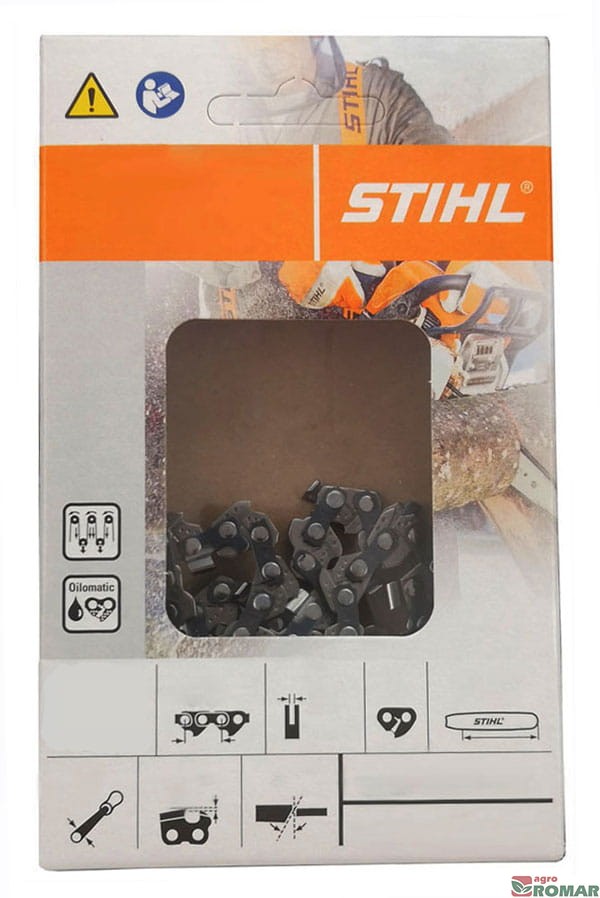 Łańcuch konfekcjonowany "z rolki" do pilarki spalinowej Husqvarna, Partner, Echo, Poulan, Ryobi, AL-KO, Oleo-Mac, Solo, Dolmar, Makita, Jonsered, NAC, Alpina, Woodshark, IKRA, Zenoah, Homelite, McCulloch, Florabest, Shindaiwa, oraz wielu pilarek chińskich. Niska skłonność do odbicia, wydłużona żywotność dzięki systemowi zgarniania oleju STIHL Oilomatic, wydłużony ząb tnący. Przeznaczony do pilarek elektrycznych i spalinowych o mniejszej mocy, do pracy w drobnym materiale.