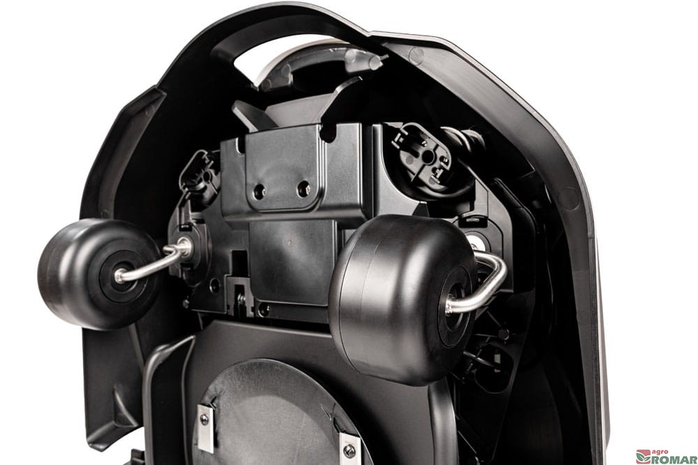 Tarcza tnąca jest zamocowana na zawiasach, dzięki czemu unosi się po najechaniu na przeszkodę, chroniąc zarówno kosiarkę, jak i otoczenie. Wysokość koszenia można regulować ręcznie w zakresie od 20 do 60 mm za pomocą pokrętła umieszczonego na obudowie.