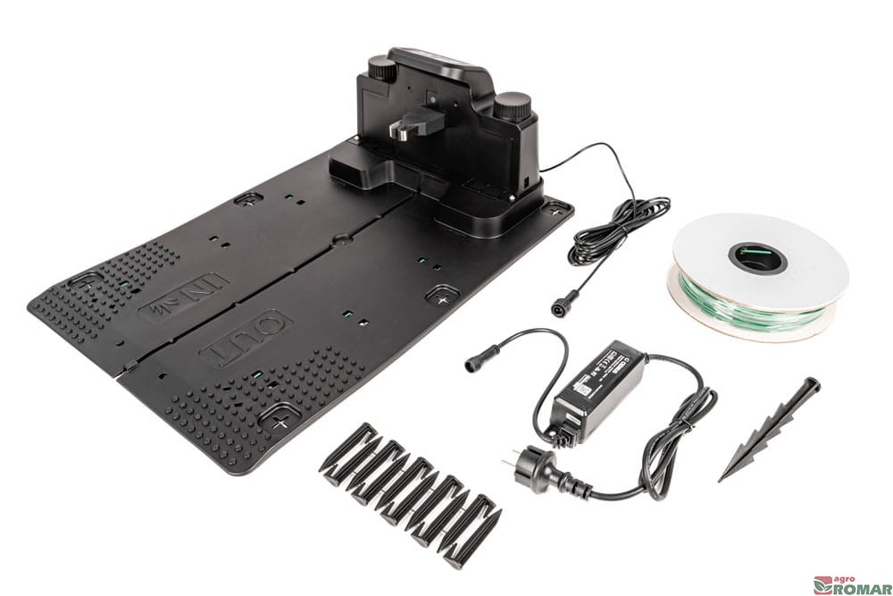 W zestawie znajduje się wszystko, co potrzebne do uruchomienia robota: stacja ładująca z ładowarką, przewód ograniczający (200 m), 250 szpilek, 6 nożyków zapasowych oraz elementy montażowe.