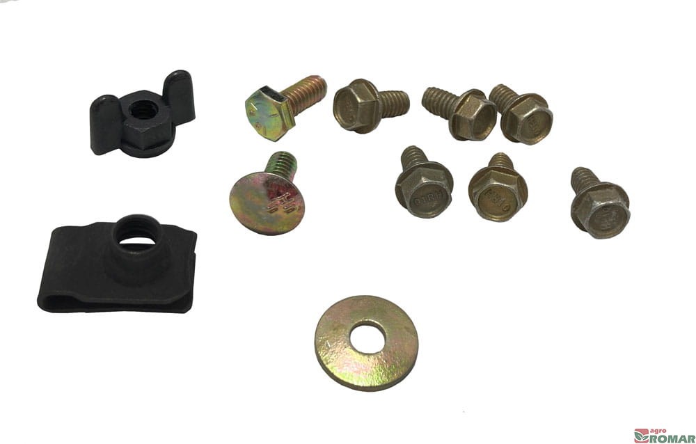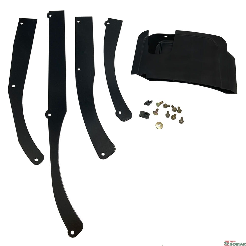 Zestaw do przezbrojenia w traktorek mulczujący, zawiera element zaślepiający wyrzut, odpowiednie listwy blokujące wyrzut trawy spod agregatu, niezbędne nakrętki, śruby, podkładki. Nie zawiera noży.