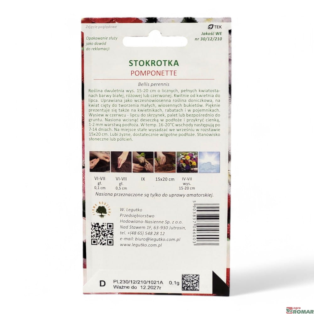 Stokrotka Pomponette mieszanka 0.10g, W. Legutko to roślina dwuletnia o wysokości 15-20 cm, która wytwarza kwiaty w kolorach białym, różowym i czerwonym. Kwitnie od kwietnia do lipca, świetnie nadając się na rabaty, kwietniki oraz do cięcia. Roślina preferuje stanowisko słoneczne lub półcieniste oraz gleby umiarkowanie żyzne. Nasiona wysiewać w czerwcu lub lipcu, a na stałe sadzić w rozstawie 15x20 cm we wrześniu.