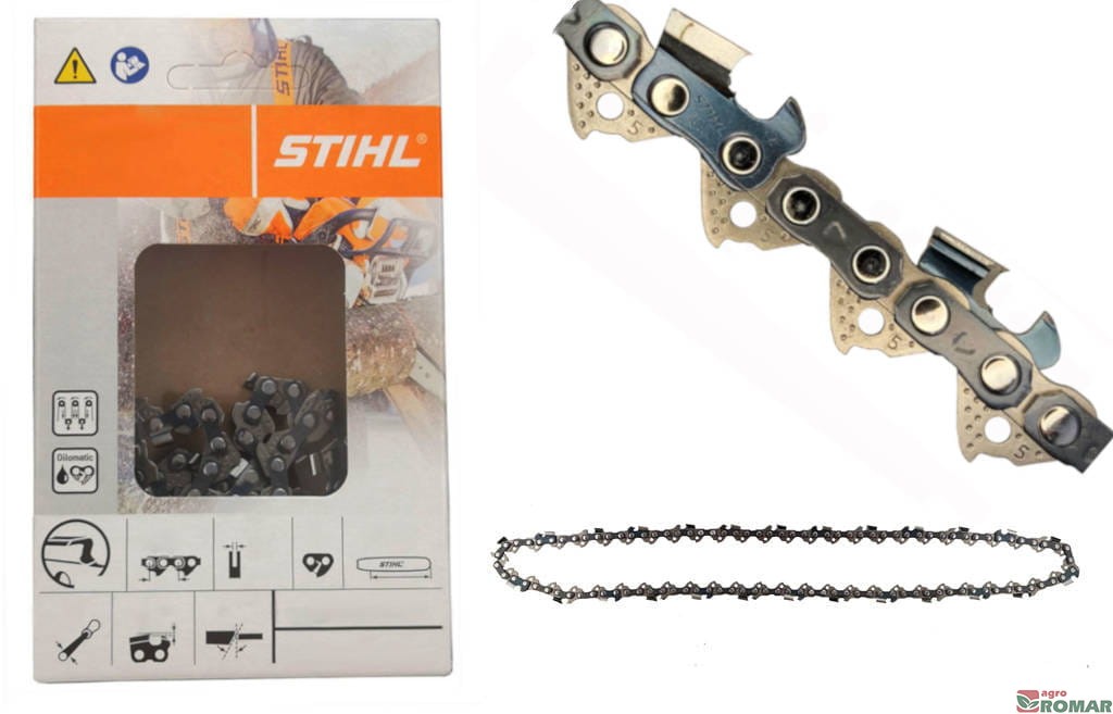 Łańcuch konfekcjonowany "z rolki" do pilarki spalinowej Husqvarna, Partner, Echo, Poulan, Ryobi, AL-KO, Oleo-Mac, Solo, Dolmar, Makita, Jonsered, NAC, Alpina, Woodshark, IKRA, Zenoah, Homelite, McCulloch, Florabest, Shindaiwa, oraz wielu pilarek chińskich. Niska skłonność do odbicia, wydłużona żywotność dzięki systemowi zgarniania oleju STIHL Oilomatic. Przeznaczony do pilarek spalinowych o mocy silnika znadującej się w przedziale 2.5KM - 4KM.