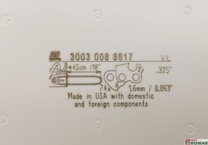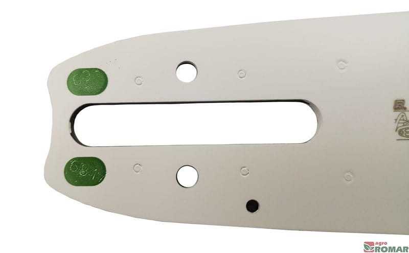 Wypalone laserowo oznaczenia prowadnicy ułatwiają jej zidentyfikowanie. Nawet po długotrwałym użytkowaniu i zdarciu wierzchniej warstwy farby pozostają łatwe do odczytania. W tabelce znajdziesz informacje o szerokości rowka, podziałce łańcucha, ilości ogniw łańcucha, oraz numerze katalogowym prowadnicy.