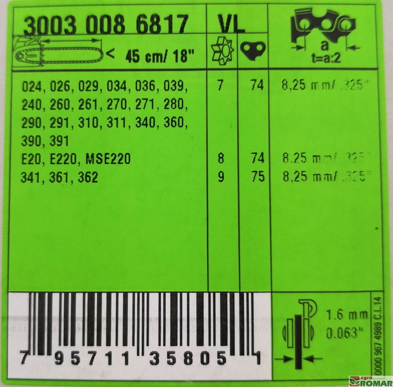 Informacje w tabeli pozwalają na łatwy dobór łańcucha do prowadnicy - na zdjęciu widzimy, że do prowadnicy pasować będzie łańcuch o podziałce 325", szerokości 1,6 mm, o długości 74 ogniw prowadzących.