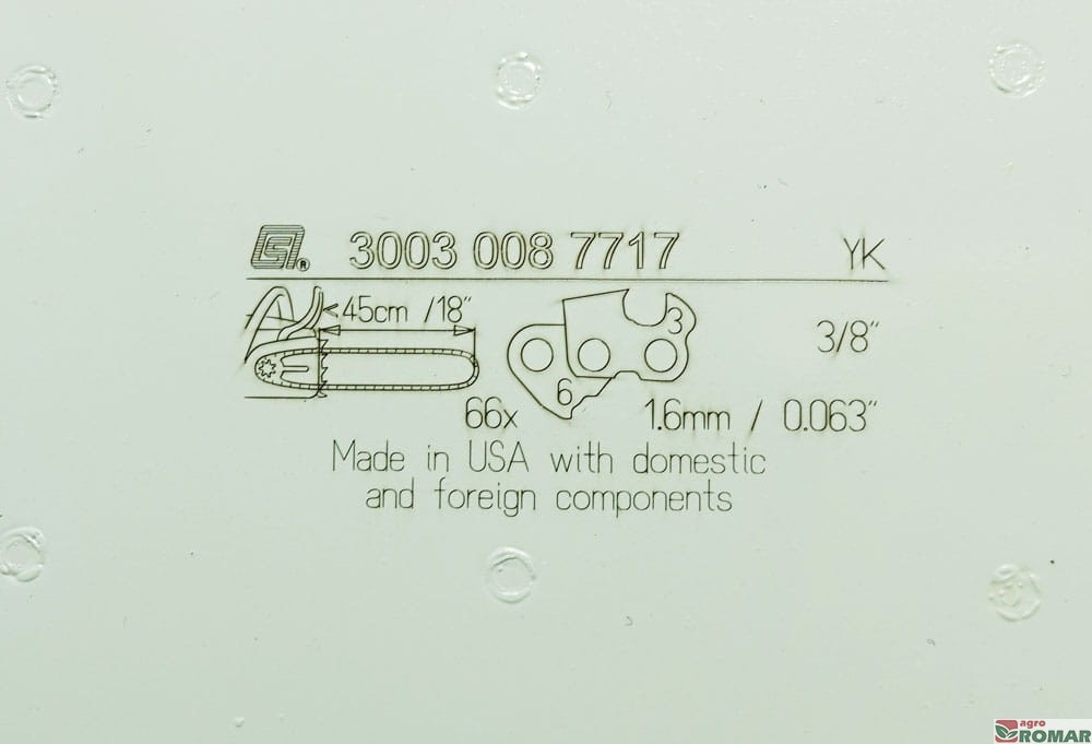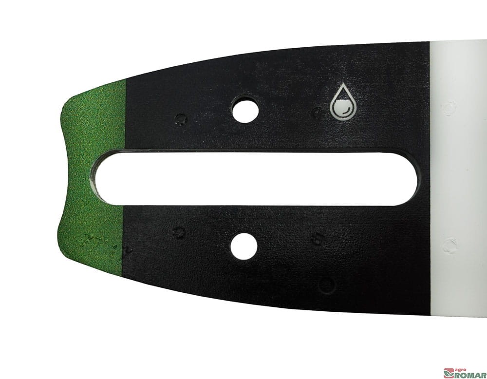 Wypalone laserowo oznaczenia prowadnicy ułatwiają jej zidentyfikowanie. Nawet po długotrwałym użytkowaniu i zdarciu wierzchniej warstwy farby pozostają łatwe do odczytania. W tabelce znajdziesz informacje o szerokości rowka, podziałce łańcucha, ilości ogniw łańcucha, oraz numerze katalogowym prowadnicy.