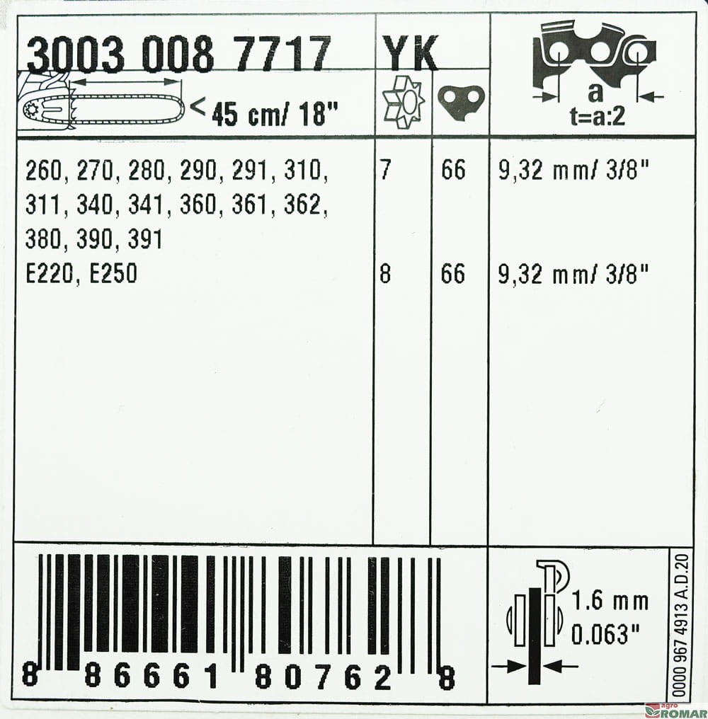 Informacje w tabeli pozwalają na łatwy dobór łańcucha do prowadnicy - na zdjęciu widzimy, że do prowadnicy pasować będzie łańcuch o podziałce 3/8", szerokości 1,6 mm, o długości 66 ogniw prowadzących.