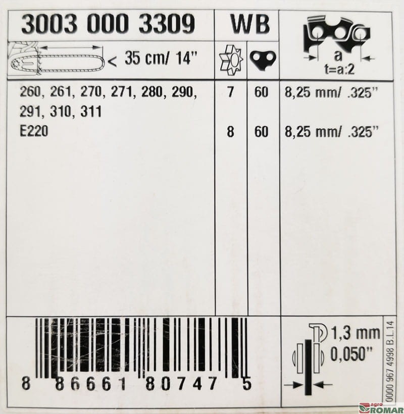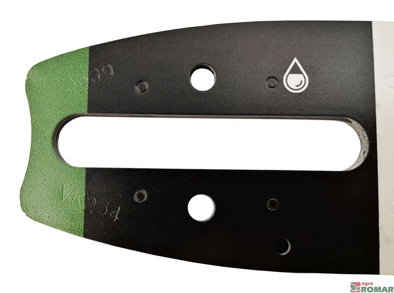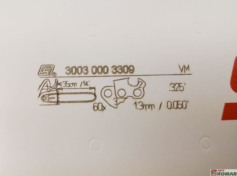 Wypalone laserowo oznaczenia prowadnicy ułatwiają jej zidentyfikowanie. Nawet po długotrwałym użytkowaniu i zdarciu wierzchniej warstwy farby pozostają łatwe do odczytania. W tabelce znajdziesz informacje o szerokości rowka, podziałce łańcucha, ilości ogniw łańcucha, oraz numerze katalogowym prowadnicy.