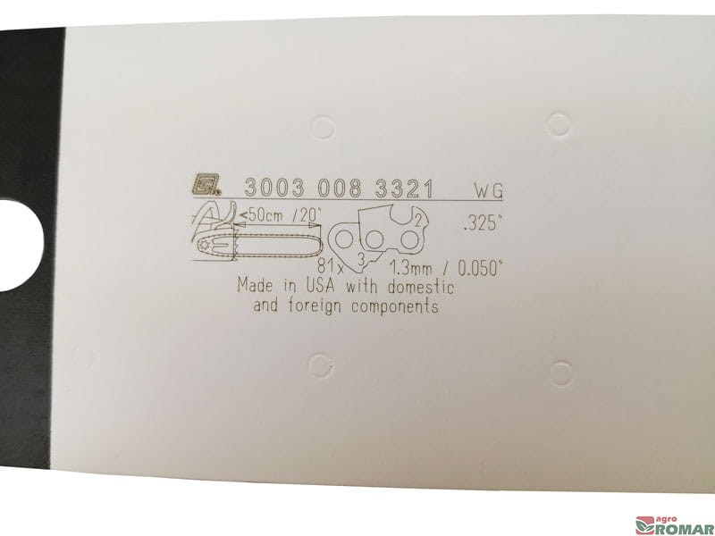 Wypalone laserowo oznaczenia prowadnicy ułatwiają jej zidentyfikowanie. Nawet po długotrwałym użytkowaniu i zdarciu wierzchniej warstwy farby pozostają łatwe do odczytania. W tabelce znajdziesz informacje o szerokości rowka, podziałce łańcucha, ilości ogniw łańcucha, oraz numerze katalogowym prowadnicy.