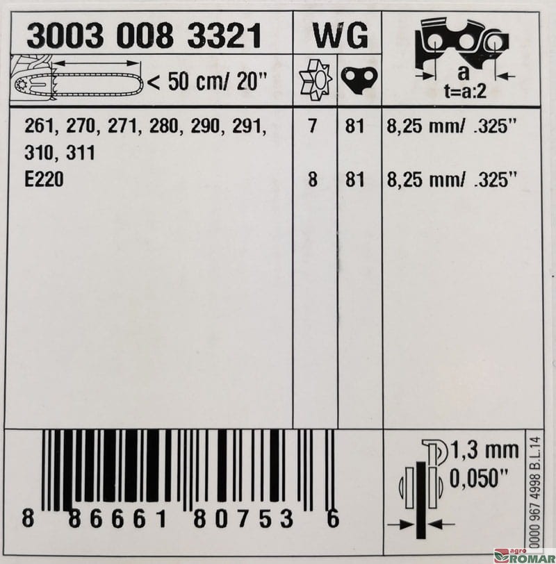 Informacje w tabeli pozwalają na łatwy dobór łańcucha do prowadnicy - na zdjęciu widzimy, że do prowadnicy pasować będzie łańcuch o podziałce .325", szerokości 1,3 mm, o długości 81 ogniw prowadzących.