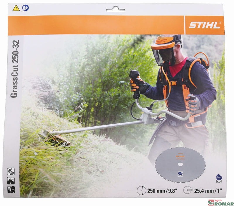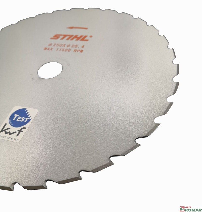 Tarcza tnąca do cięcia trawy STIHL o średnicy 250 mm wyposażona w 32 zęby z ramionami wyrzutowymi znacznie zmniejsza siłę odbijania małych, przypadkowych elementów takich jak np. kamyki. Takie rozwiązanie zwiększa bezpieczeństwo i komfort pracy.